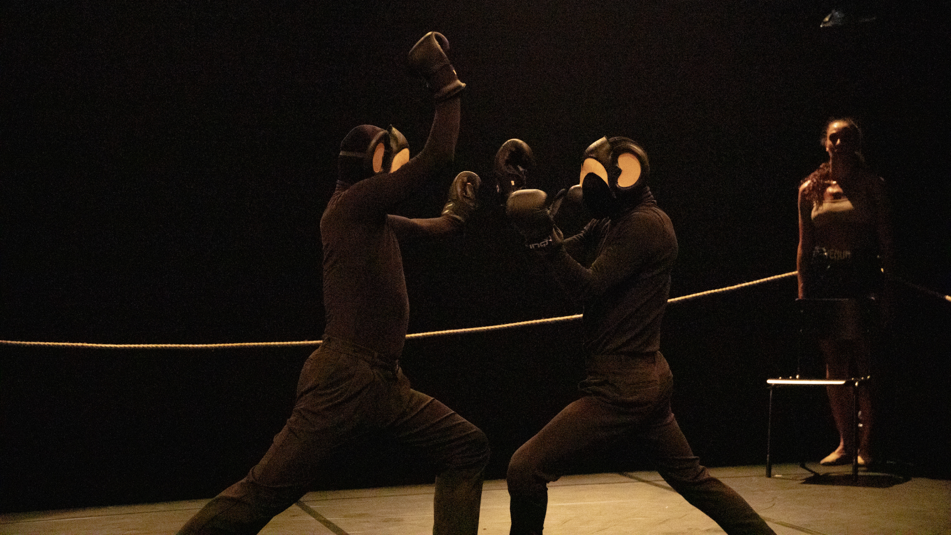 Neem plaats rondom de boksring waarin dansers boksers, en boksers dansers worden. Elkaar uitdagend met rake stoten, snel voetenwerk en virtuoze tactiek worden in uitputtende rondes verhoudingen op scherp gezet.